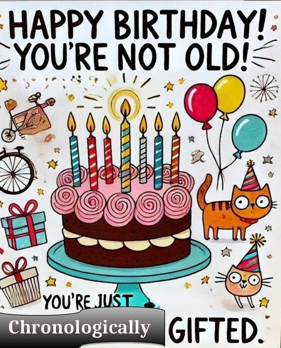This card is colourful and vibrant. It depicts a birthday cake with candles in the centre of the card, there is balloons and presents around the edge. The words "Happy Birthday! You're Not Old" at the top. and the words "You're Just Chronologically Gifted" at the bottom.