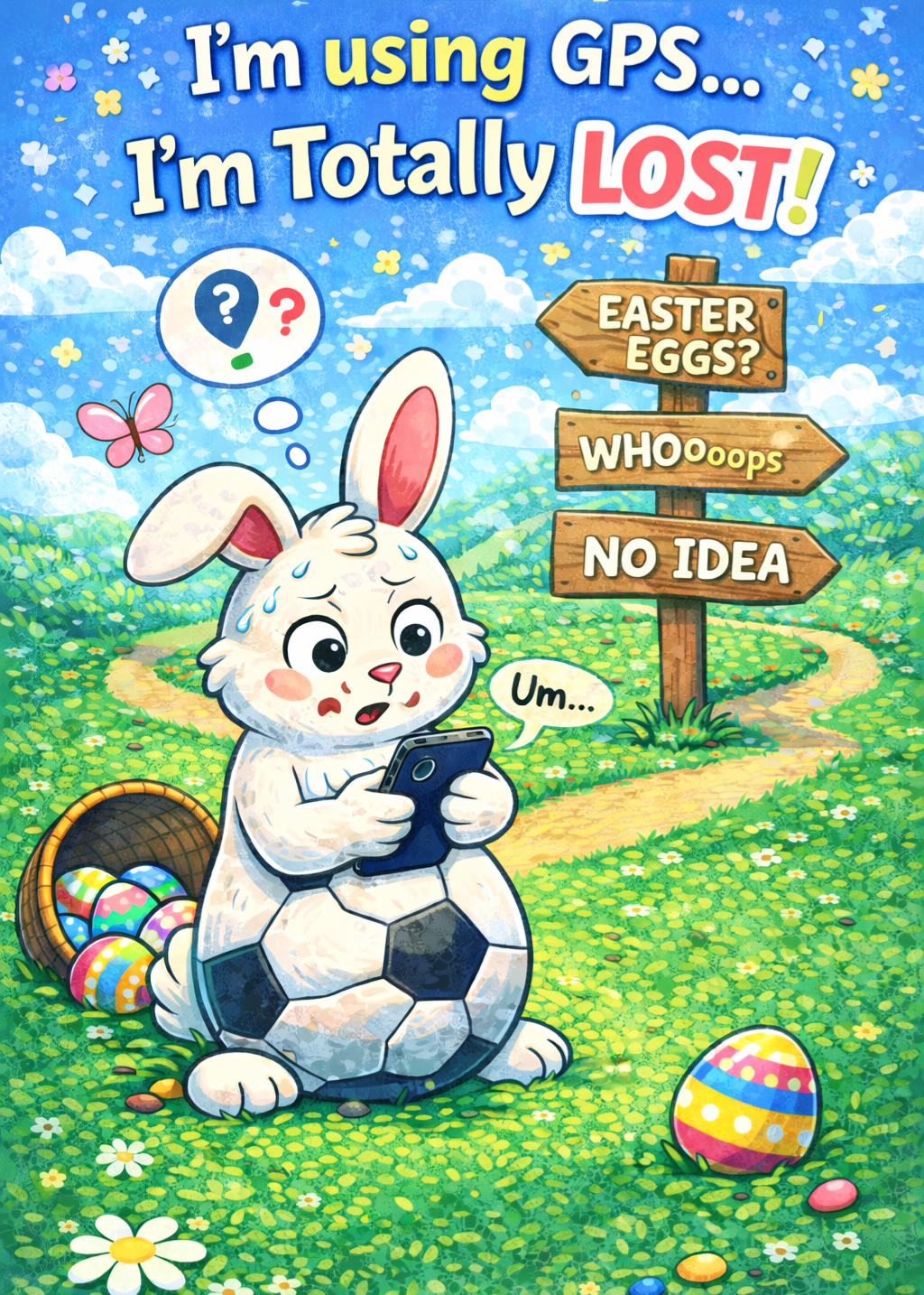 A cartoon bunny stands in the middle of a bright, grassy field. The bunny is wearing a big round costume that looks like a black‑and‑white football. It’s holding a smartphone and looks confused, with a little sweat drop on its face. A speech bubble above its head says “Um…”.
