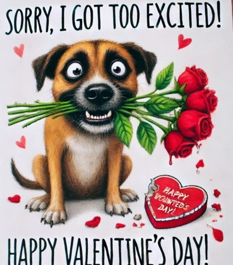 This card is colourful and lively, featuring a puppy facing you with a bunch of red roses in its mouth, a heart lies on the floor beside him. At the top of the card is the words "Sorry, I got too excited!" and at the bottom "Happy Valentine's Day!". Additionally, the card includes a Braille insert that replicates the described image, ensuring accessibility for all. The card offers customizable options, allowing you to add a personal message in both Braille and print.