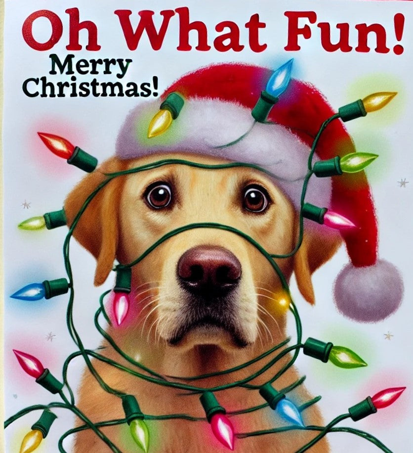 The card features the head and neck of a Labrador dog looking directly at you, adorned with a Christmas hat and wrapped in festive lights. The phrase "Oh What Fun! Merry Christmas!" is prominently displayed at the top, making it a perfect choice for dog enthusiasts.