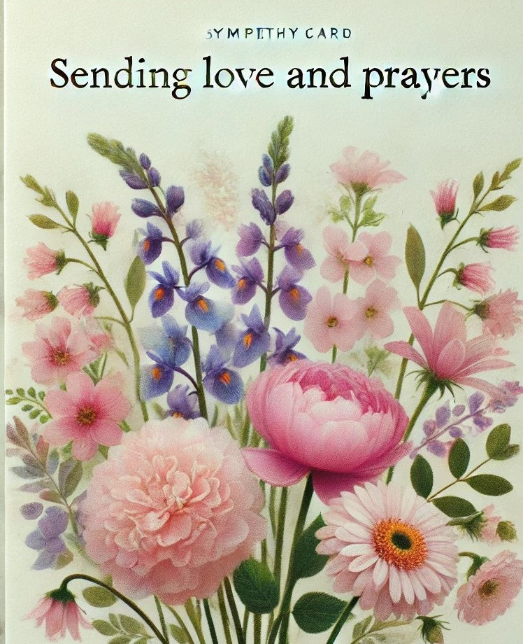 This elegant card showcases an assortment of multi-colored floral arrangements with the sentiment "Sending Love and Prayers." The design offers understated emotional resonance while maintaining sophistication. The interior contains a tactile reproduction of the cover image, allowing accessibility through touch. Your personalized message can be included inside using Braille, Large Print, or both formats according to your preference.